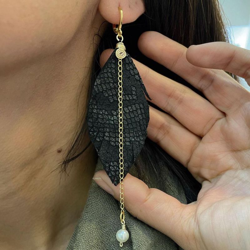 Vangania aretes largos con pluma y perla Mallorca joyería artesanal boho chic