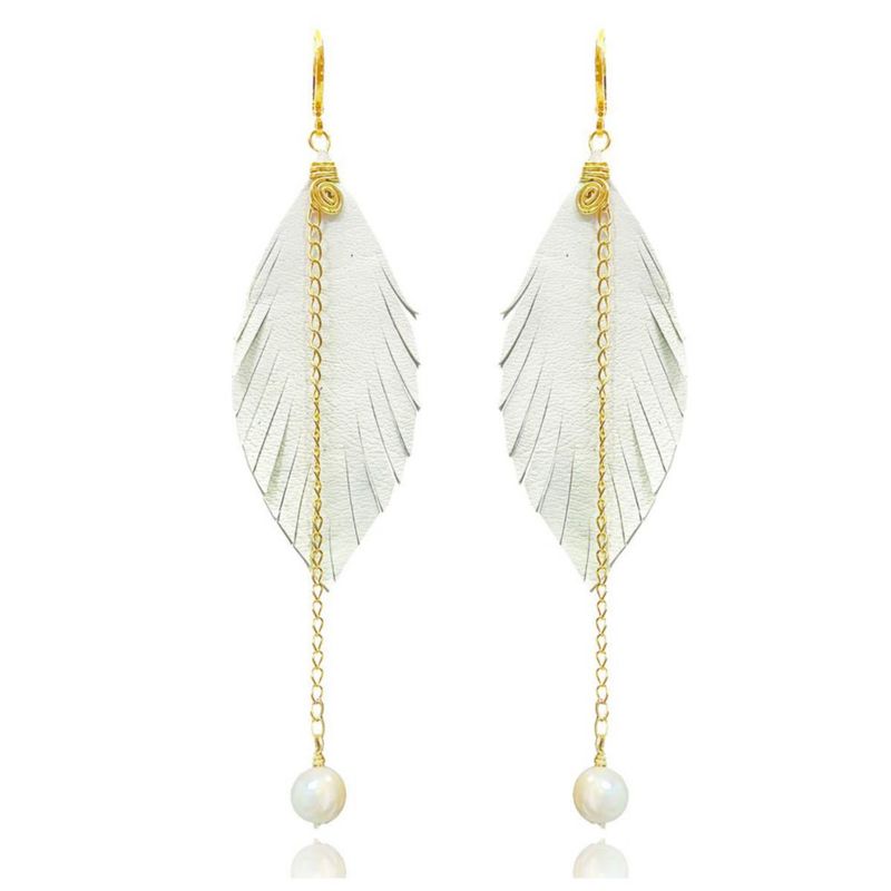 Vangania aretes largos con pluma y perla Mallorca joyería artesanal boho chic