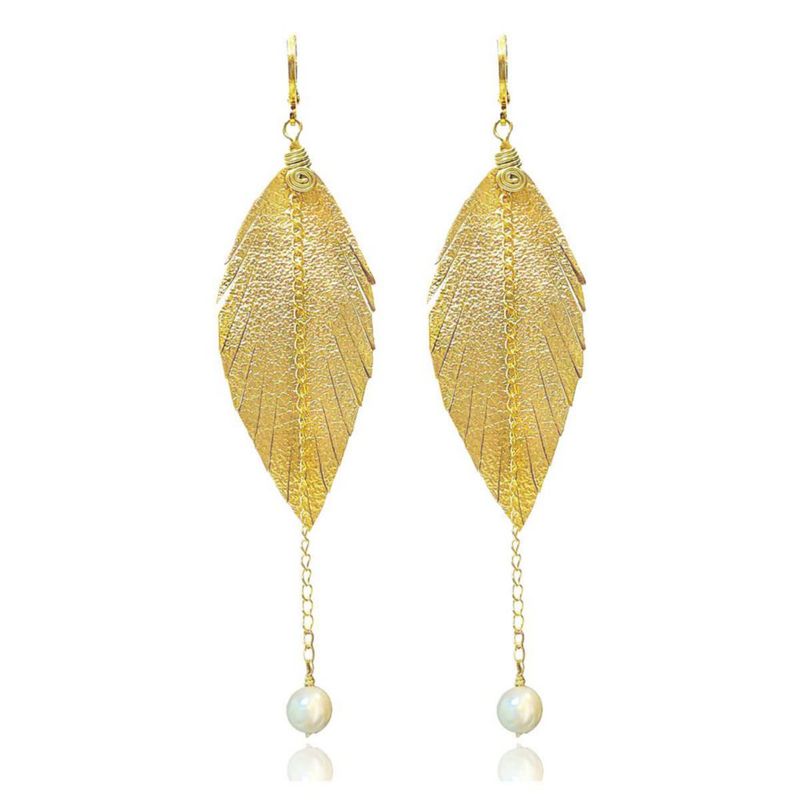 Vangania aretes largos con pluma y perla Mallorca joyería artesanal boho chic