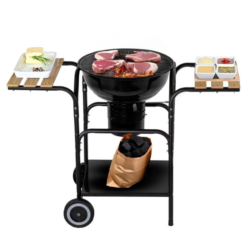 Asador de carbón 18" - 44cm con mesas laterales de madera y ruedas AVERA AC18ML