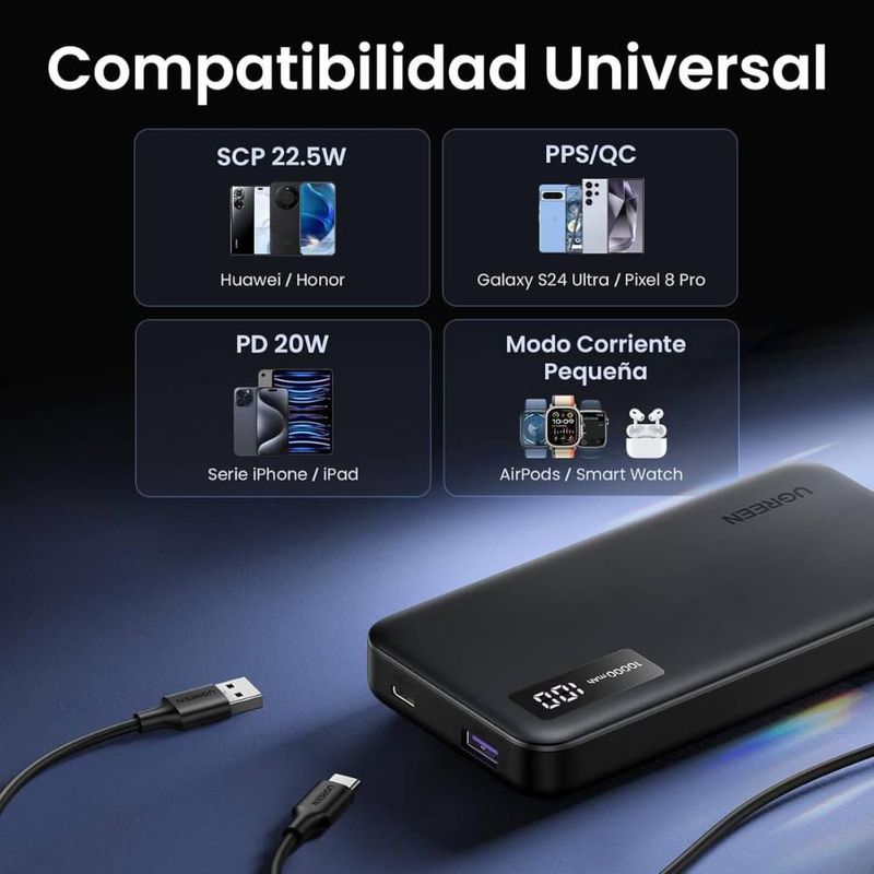 Batería portatil 10,000mAh PB311 UGREEN USB C 20W Pantalla LED Negro