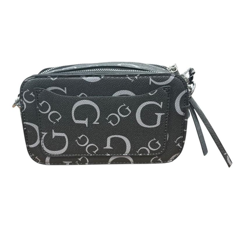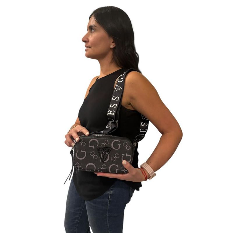 Bolsa chica Crossbody GUESS color negro con letras grises, asa desmontable y ajustable blanca, doble cremallera, mide 20 cm de ancho por 13 cm
