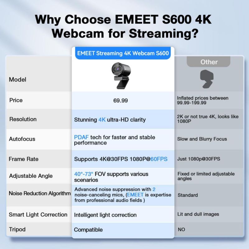 Cámara web EMEET S600 4K para streaming con sensor Sony de 1/2.5"
