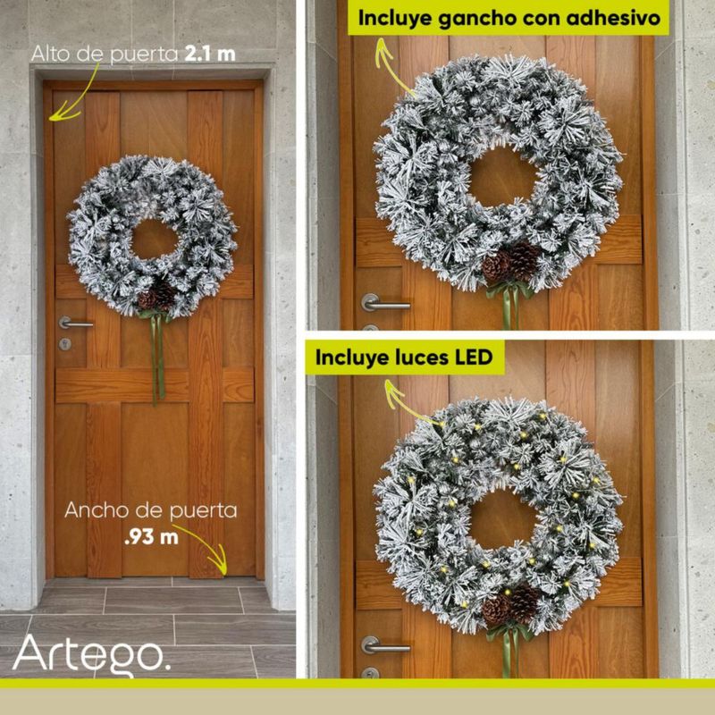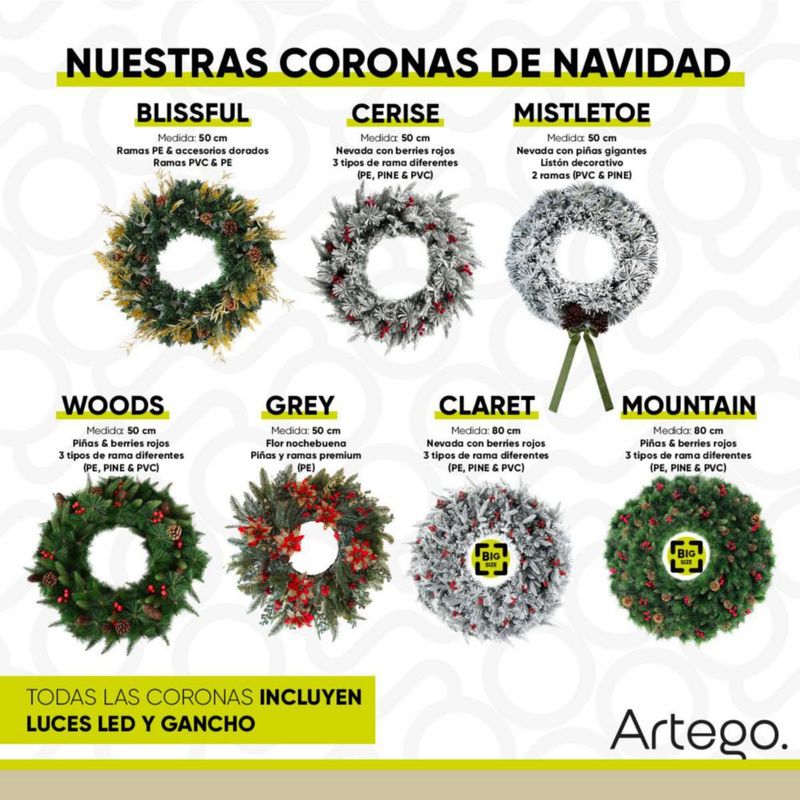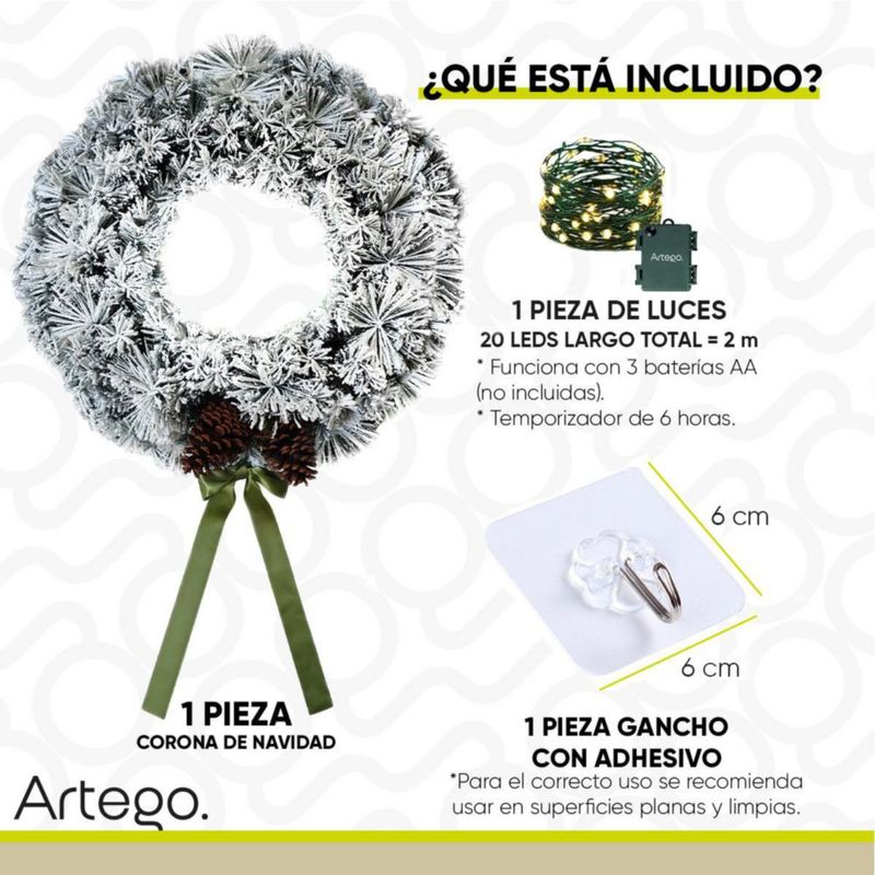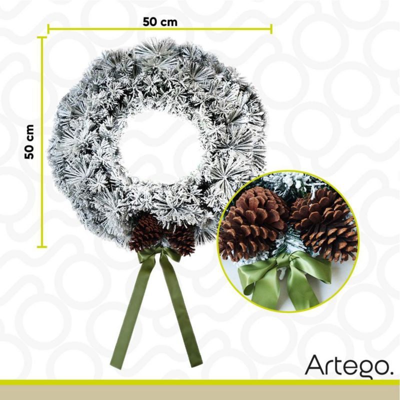 Corona de Navidad 50cm Iluminada nevada con 2 piñas gigantes mistletoe con 2 tipos de rama pine y pvc Guirnalda Luces LED Cálida Nevada Decorada