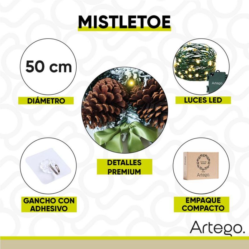 HogarDecoraciónAdornos de NavidadCorona de Navidad 50cm Iluminada nevada con 2 piñas gigantes mistletoe con 2 tipos de rama pine y pvc Guirnalda Luces LED Cálida Nevada Decorada