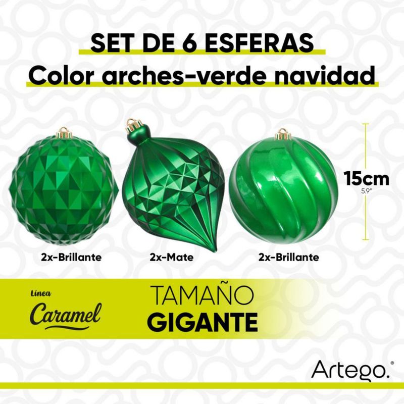 HogarDecoraciónAdornos de NavidadEsferas para árbol de navidad Artego extra grandes de 15 cm de diámetro paq 6 esferas Verde Navidad * Línea Caramel 3 texturas y acabados diferentes