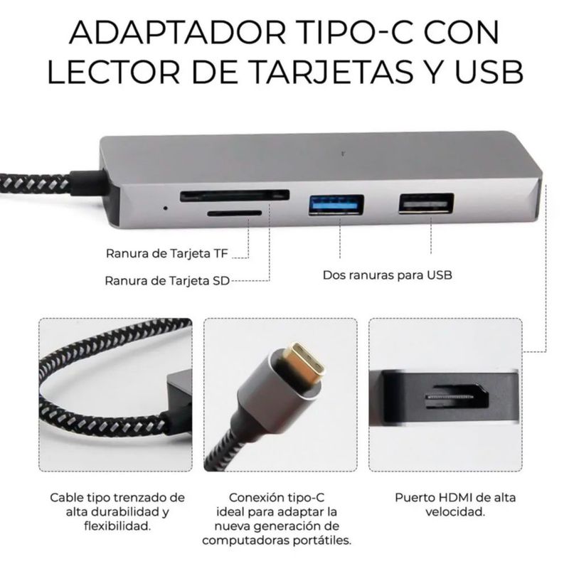 Hub Adaptador USB Tipo C 5 en 1 | HDMI 4K, 2 Puertos USB 3.0, Lector SD/Micro SD