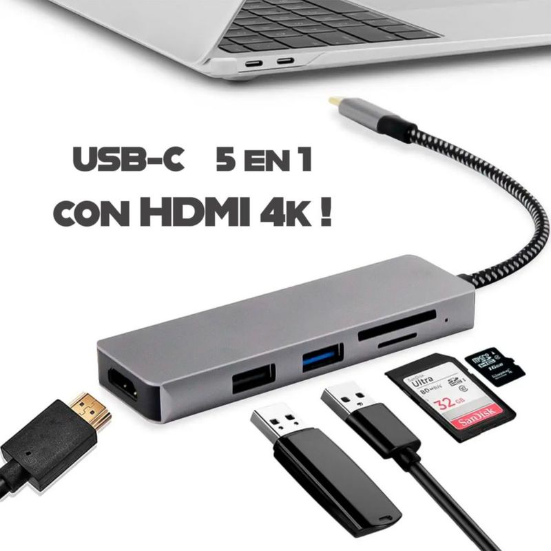 CómputoAccesorios y periféricosHubHub Adaptador USB Tipo C 5 en 1 | HDMI 4K, 2 Puertos USB 3.0, Lector SD/Micro SD