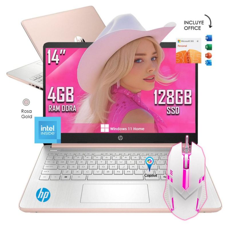 Laptop HP 14-dq6015dx Intel N150 4GB RAM 128GB SSD Rose Gold Windows 11 + Office incluido + Mouse