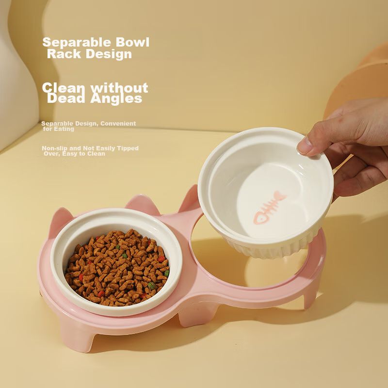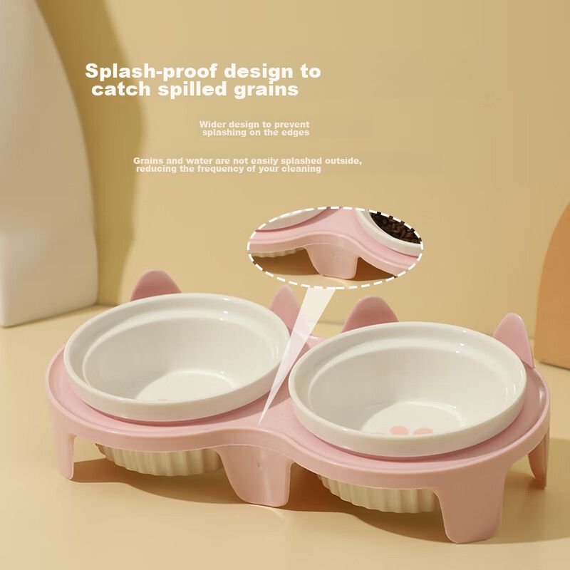 MascotasGatosComederos y BebederosLicheers Tazón Cerámico para Gatos, Compartimentos Dobles, Blanco
