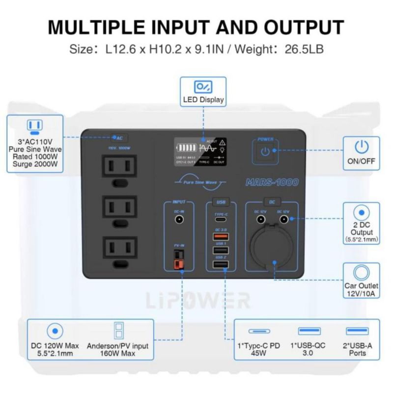 LIPOWER MARS-1000 Estación de Energía Portátil 1000W - 1100Wh Batería de Respaldo - Azul