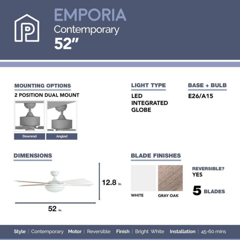 Prominence Home Ventilador de Techo de 52" con Luz y 5 Aspas Reversibles con Control Remoto, Modelo Emporia