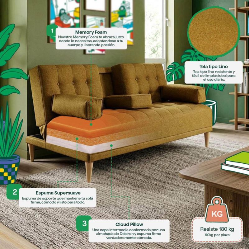 MueblesSalaSillones y SofásSofá Cama Makora Queen Con Memory Foam Color Mostaza Lino Respaldo Reclinable De 3 posiciones